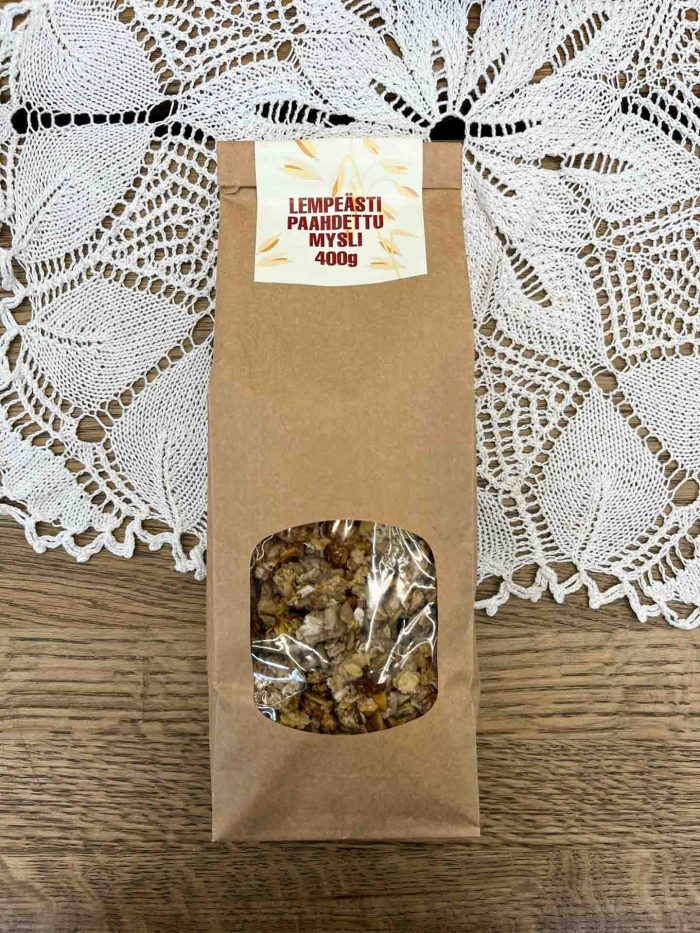 Lempeästi paahdettu mysli on valmistettu suomalaisista pientilan kaurahiutaleista, auringonkukan siemenistä, kurpitsansiemenistä ja se on makeutettu suomalaisella hunajalla. Tämä mieto ja pehmeä mysli paahdetaan käsityönä erityisen lempeällä lämmöllä Ylöjärvellä.